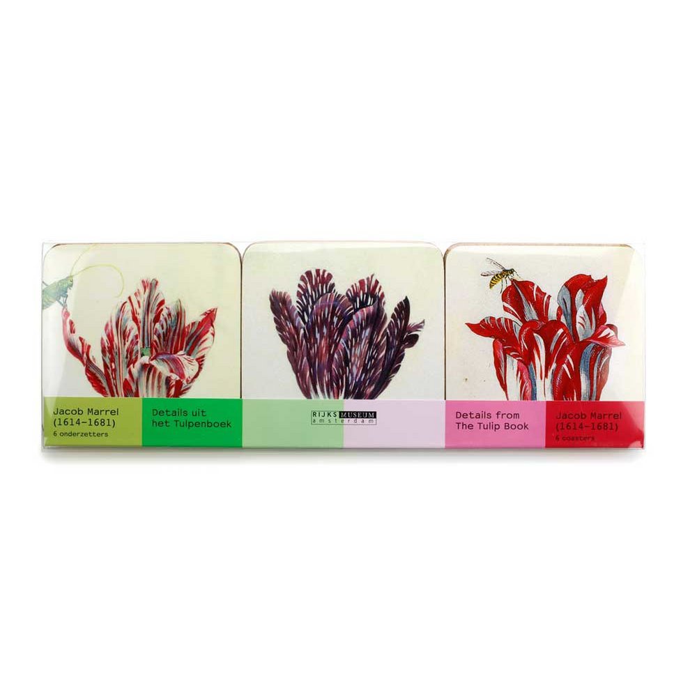 Set van 6 glazen onderzetters met 6 afbeeldingen van de tulpen geschilderd door Jakob Marrel (1613 - 1681). Gemakkelijk schoon te maken, onderzetters met een kurklaag, hittebestendig laminaat oppervlak, gepresenteerd in een doorzichtige verpakking.