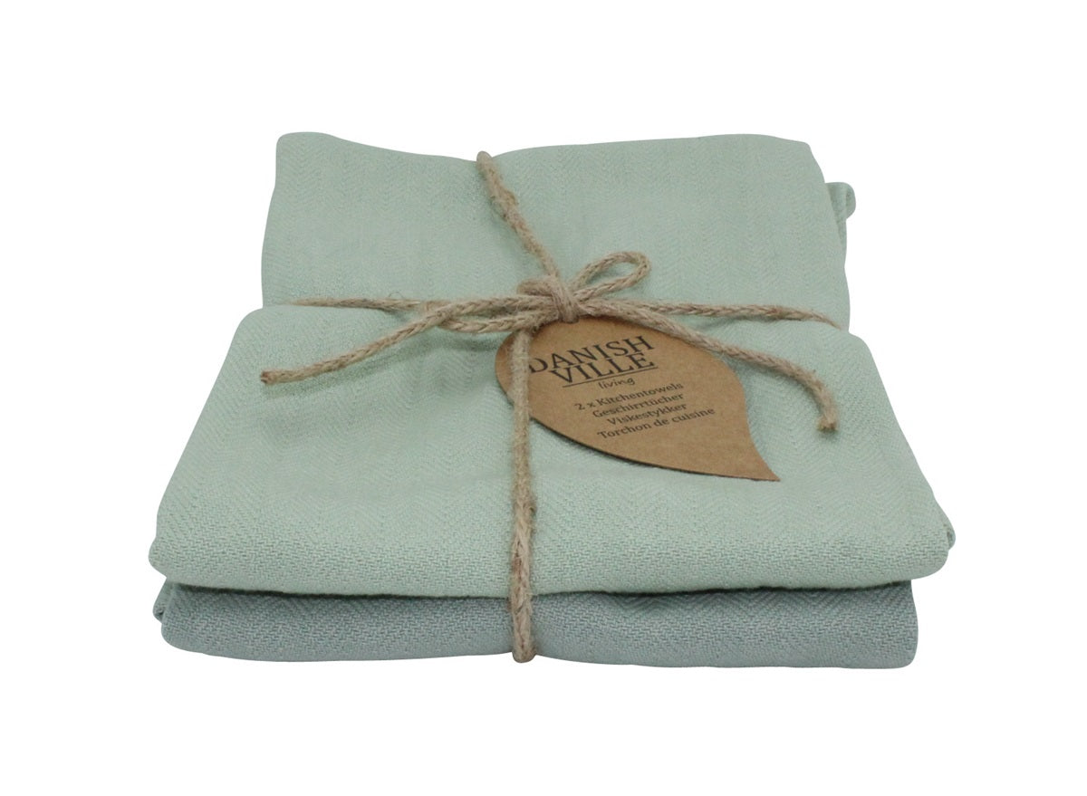 set van 2 theedoeken in 2 kleuren groen 100%katoen. 70x45 cm.