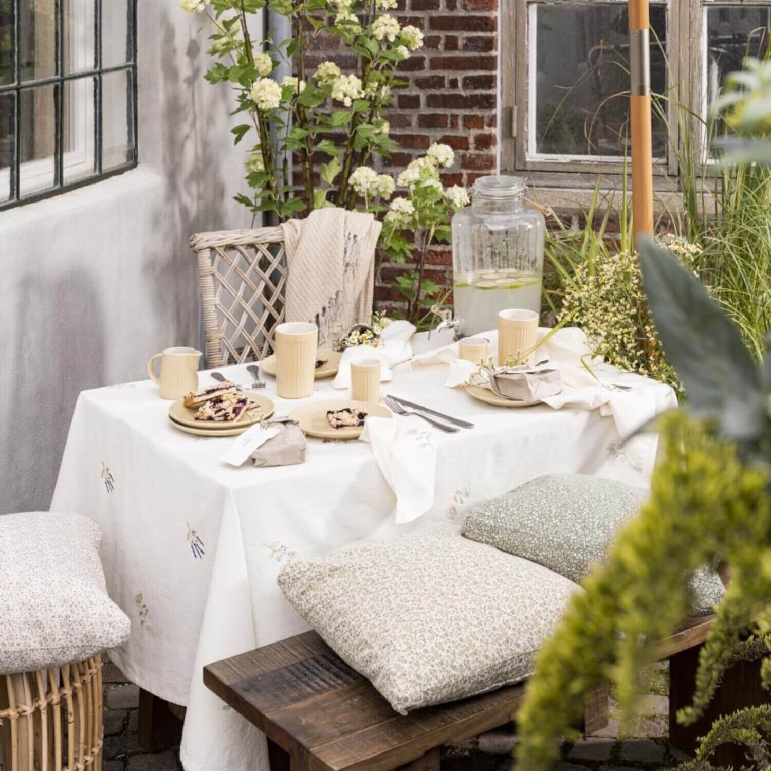 Langwerpig tafelkleed van IB Laursen in de kleur botercrème, geborduurd met madeliefjes, korenbloemen en boterbloemen. Met dit tafelkleed creëer je een stijlvolle en gezellige uitstraling voor elke tafelsetting, zowel binnen als buiten.