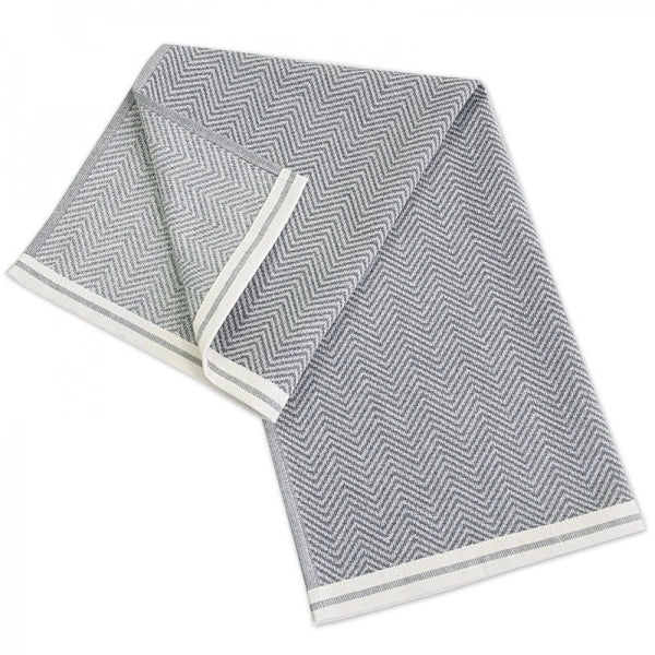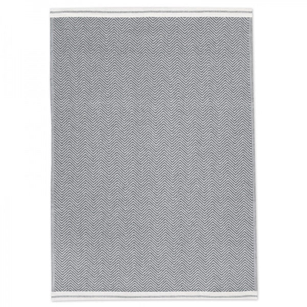 Prachtige natuurlijke theedoek met donkerblauwe/zandkleurige visgraat.